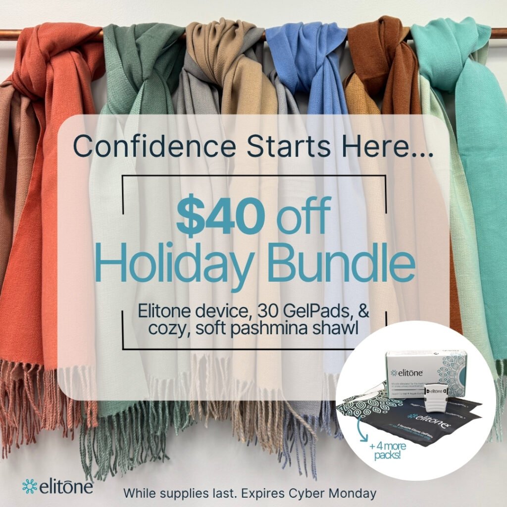 Take control of bladder leaks and step confidently into the new year with Elitone! Whether you need to strengthen your pelvic floor with Elitone or soothe bladder urges with Elitone URGE, now’s the perfect time to start. This Black Friday, enjoy $40 off the Elitone bundle! This includes an Elitone device, 6 packs of GelPads, & a FREE cozy shawl in your favorite color. Don’t miss this limited-time offer to feel confident all year long.