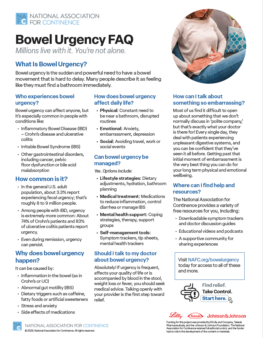 The Bowel Urgency FAQ answers common patient questions in a simple, approachable format. It explains what bowel urgency is, who commonly experiences it, possible causes and triggers, how common it is, how it can affect physical, emotional, and social wellbeing, and when to talk to a doctor. It also reassures patients that they are not alone and points them toward additional NAFC resources for education and support.